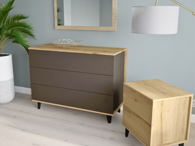 Συρταριέρα και κομοδίνο FERA. Διαθέτουν Premium Γκρι εσωτερικό συρταριών και αθόρυβο τηλεσκοπικό μηχανισμό πλήρους επέκτασης. Μπορούν να συνδυαστούν με το υπέροχο Intra 0074 στα πλαϊνά του επίπλου και στις όψεις των συρταριών.